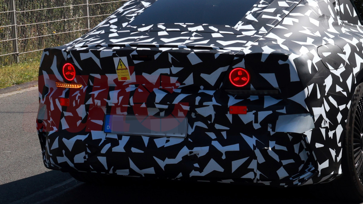 This prototype is equipped with production-ready headlights and taillights, the former of which will integrate, like the new CLA and other incoming Mercs, a large three-pointed star in their daytime running light graphics in a cluster shape that has come to be recognizable as a Mercedes design. At the rear, the triangular motor appears once more, but within round taillight elements. Although only one is evident here, we expect each side to have a cluster of three round taillights, and we suspect that the turn signal indicators seen being activated on this mule are only temporary placeholders; we can't see Mercedes spending unnecessary money on a separate lighting unit when modern LEDs can change colors so effectively.